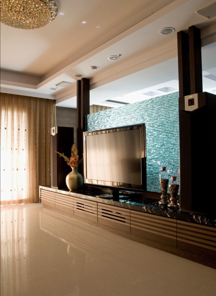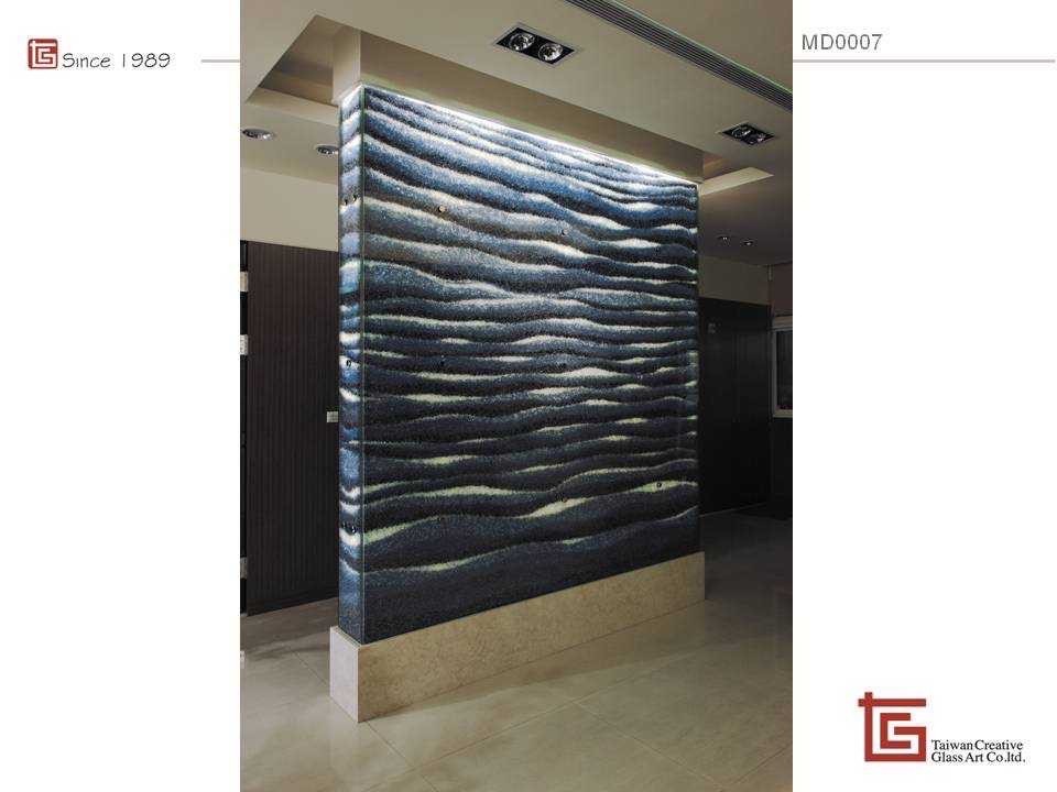 - 客廳的主牆,用玻璃藝術展現主人的品味