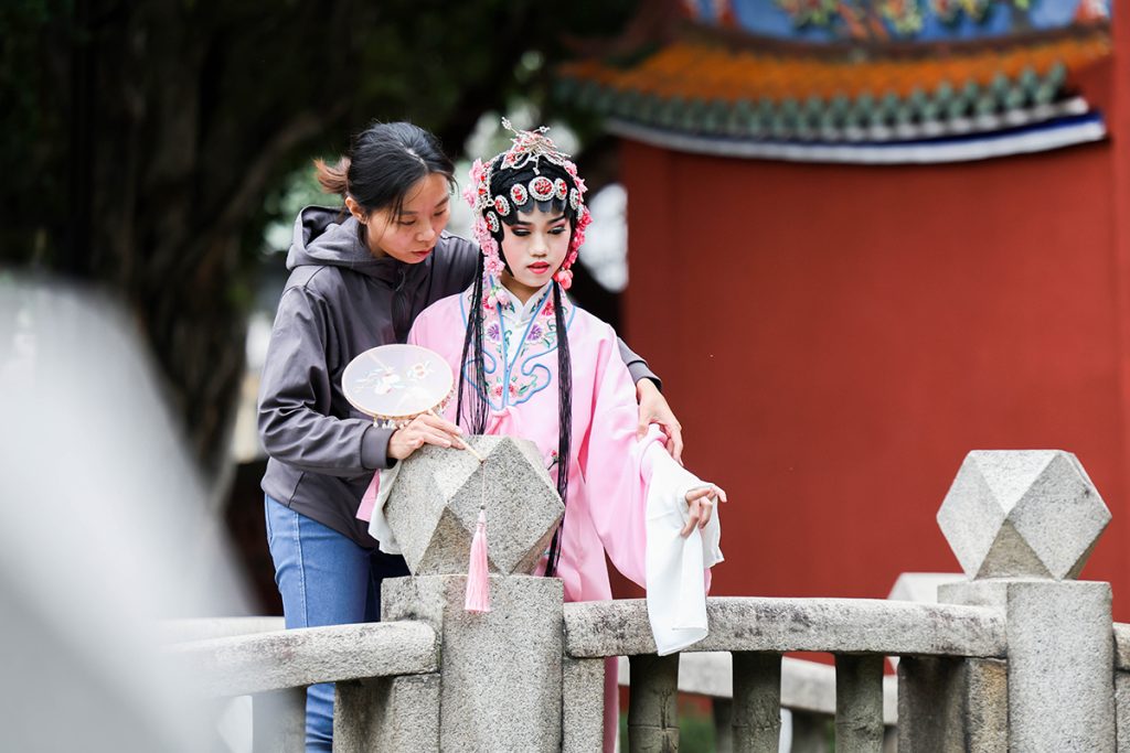繫服最有辨識度的服務,是把戲服體驗做得專業又有沈浸感。專業妝髮與服飾工藝講解之外,兩位老師會依角色類型調整站姿、眼神與身段,再透過攝影引導把角色氣質定格下來。參與者不只是好看,更能「好理解」——原來花領、雲肩、甲片與配色都有角色線索;原來唱、唸、做、打的節奏,也能在一張照片上被看見。