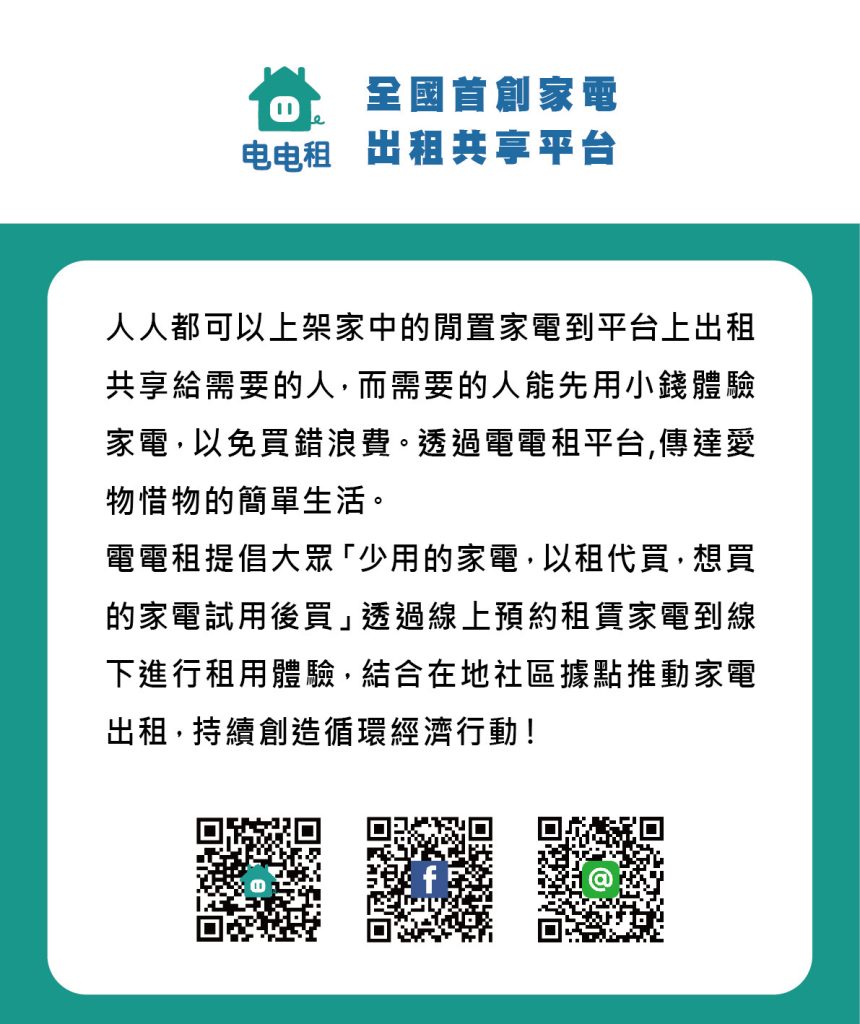 她們希望讓個人或合作夥伴不只是被動使用平台,而是能夠成為共享服務的一部分。當更多人願意把閒置家電釋放出來,或者透過媒合與出租參與其中,整個平台就不只是租賃工具,而會慢慢形成一個共享生態系。這種設計,也讓電電租不只是一個新創服務,而是一種把生活資源重新組織、重新流動的方式。